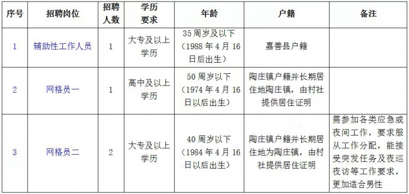 具体岗位要求详见附件1《陶庄镇公开招聘工作人员计划及岗位需求表》。