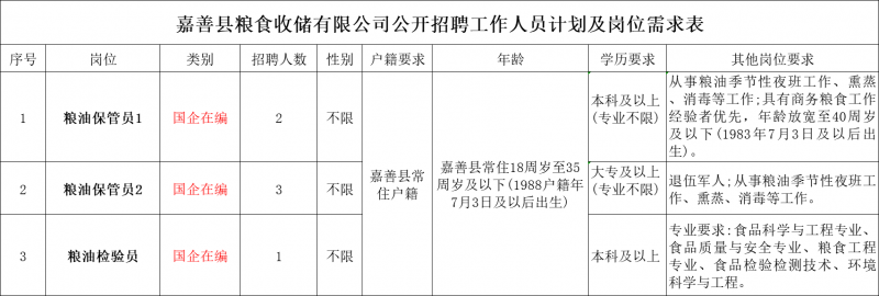 3.年龄及身体状况:具体年龄要求详见附件1《嘉善县粮食收储有限公司公开招聘工作人员计划及岗位需求表》;身体健康。