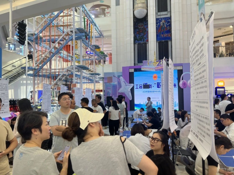 8月31日下午,2024年嘉善县总工会夏季综合性人才招聘会于万联城商圈举办。这场招聘会与往常一样设立在商场中庭开展,又正值周末,现场人头攒动,热闹非凡。